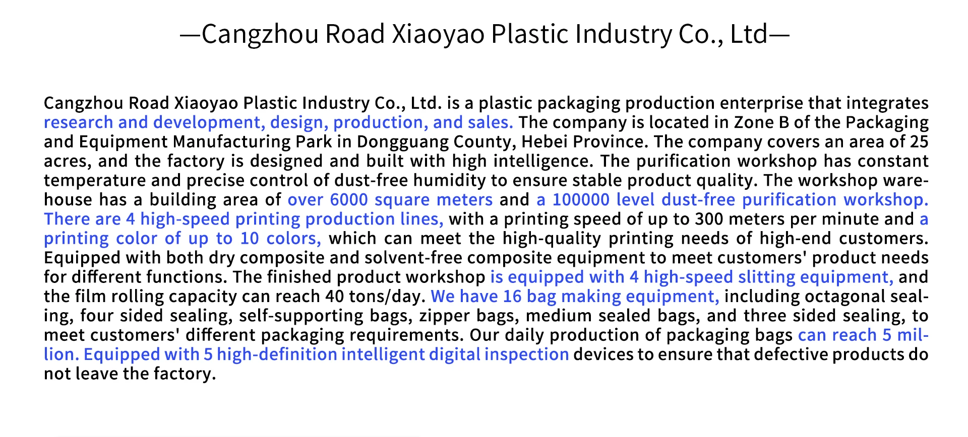Productos principales:Bolsa de pie, bolsa de vacío, bolsa ziplock, bolsa de embalaje de plástico
